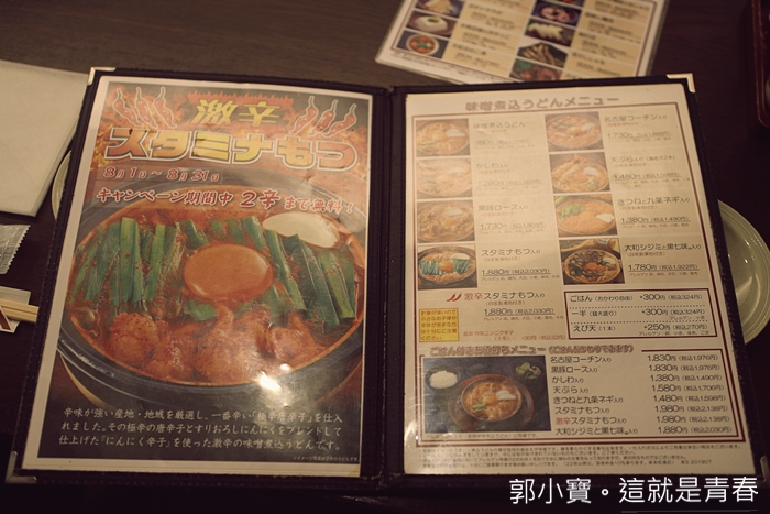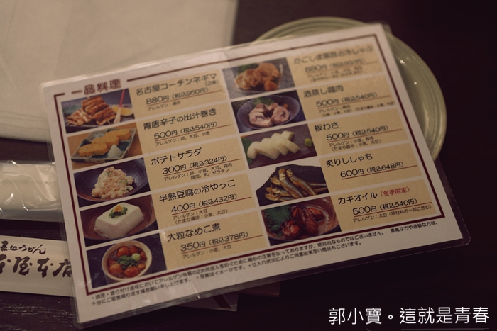 | 菜單裡面販售的鍋燒烏龍麵品項非常多,除了鍋燒烏龍麵以外還有燒烤的三角骨據說也是招牌,但是當天晚上齊食我們預計要吃好幾家,所以就直接入手招牌鍋燒烏龍麵。 |