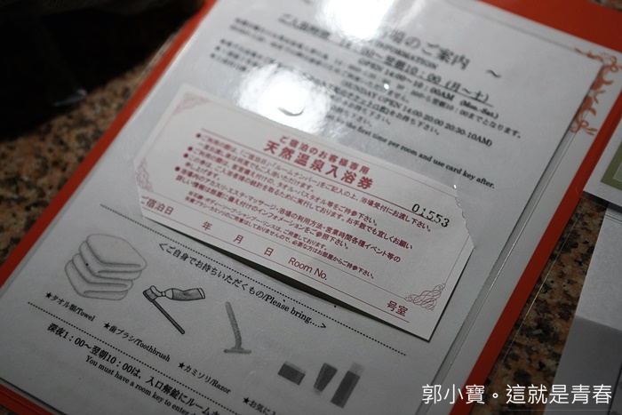 | 辦理入房手續的時候,櫃台會給天然溫泉泡湯劵,這飯店底下是有天然溫泉的泡湯池的,除了接待旅客以外,好像也有接待單純來泡湯的遊客。 |