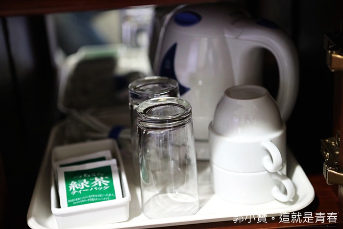 | 書桌下方的置物櫃有茶包跟快煮壺,快煮壺使用前一定要先看有沒有洗乾淨,雖然日本我幾乎還沒有遇過沒洗乾淨就給客人使用的,但是在台灣遇過太多次了,所以還是先看一下比較保險。 |