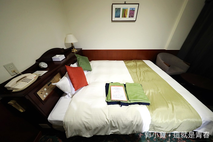 | 床鋪是標準的雙人床,床還算是偏硬,睡一覺起來也不會腰酸背痛,枕頭配備是單顆枕頭加抱枕,因為後來就用抱枕墊高,所以就沒問櫃台可不可以免費加枕頭了,大部分的旅店都可以免費加枕頭,浴衣睡袍還算好穿。 |