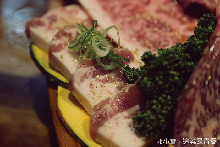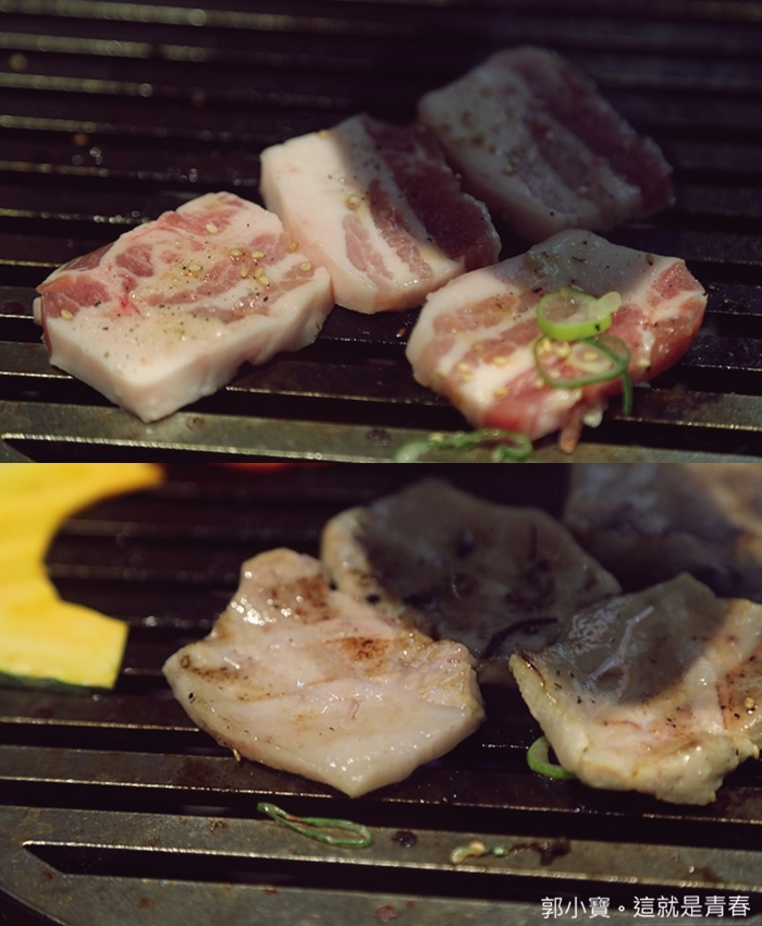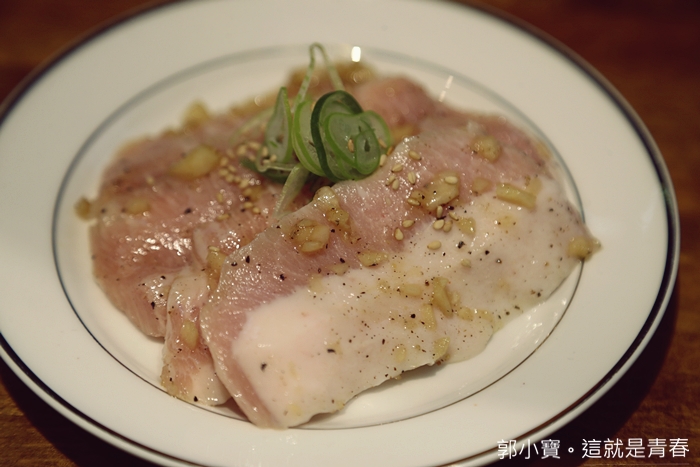 | 本來沒有在盛合裡面的林豚也不知道為什麼會出現在這盛合裡面,林豚ロース似乎也是燒肉一丁目非常有人氣的豬肉品相,看起來非常油的部位,且還沒烤以前算有一點厚度,烤完後就有一點薄了XDDDD |