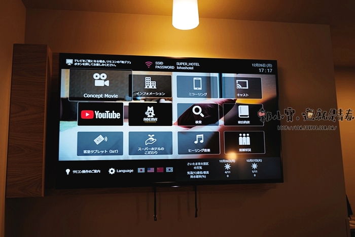 | 打開電視就可以看到WIFI的帳號跟密碼,電視是可以手機鏡像跟擁有電視盒的,所以很方便可以讓女兒看她習慣看的YT節目。 |