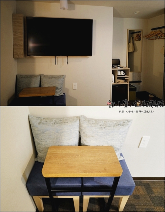 | 床墊的對方就是一張小桌子跟兩針椅子,電視是壁掛的,一旁就是電器櫃跟衣櫥。 |
