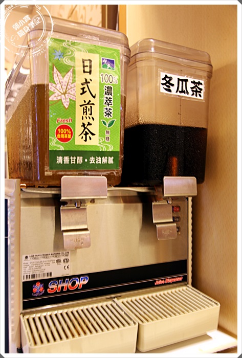 | 餐點上來的時候後托盤會附贈一個茶杯,這邊的飲料可以無限暢飲,有日式煎茶跟冬瓜茶兩種選擇,日式煎茶還滿道地的。 |