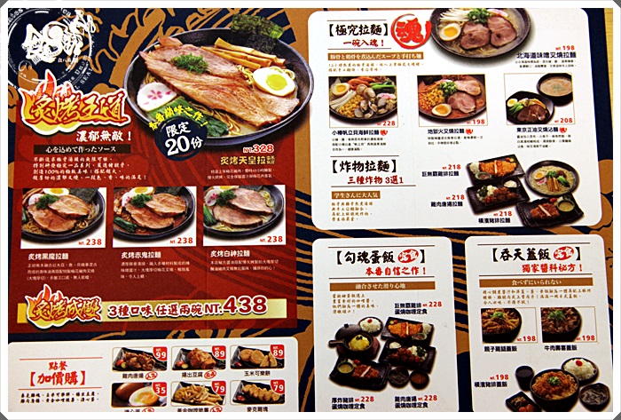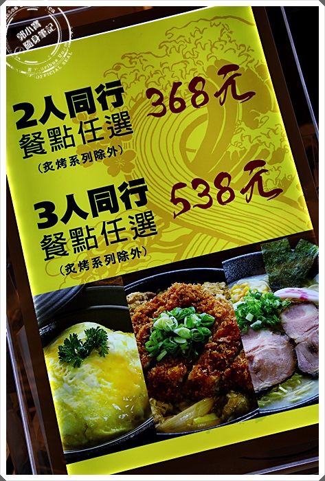 看到店門前的一個活動是2人同行優惠價368,3個人同行是538,看起來似乎相當的划算,但是炙烤系列除外,菜單看起來已相當的豐富,都是我熟悉的日本味,炙烤拉麵的部分最主要是叉燒的部分炙烤過,但是炙烤拉麵的部分自有活動兩碗438組合價,其他沒有炙烤的產品就可以跟著店口的組合搭配進行活動。