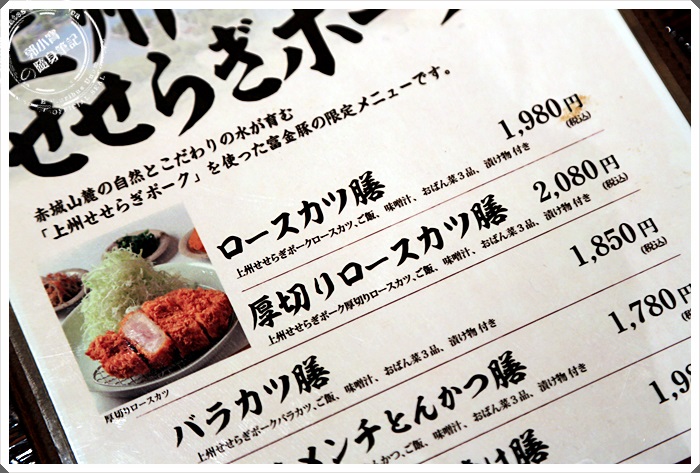 | 看起來好像很多選項,其實來來去去就那幾種,不過好吃的豬排幾種就夠了,群馬上的豬種我是第一次吃到。 |