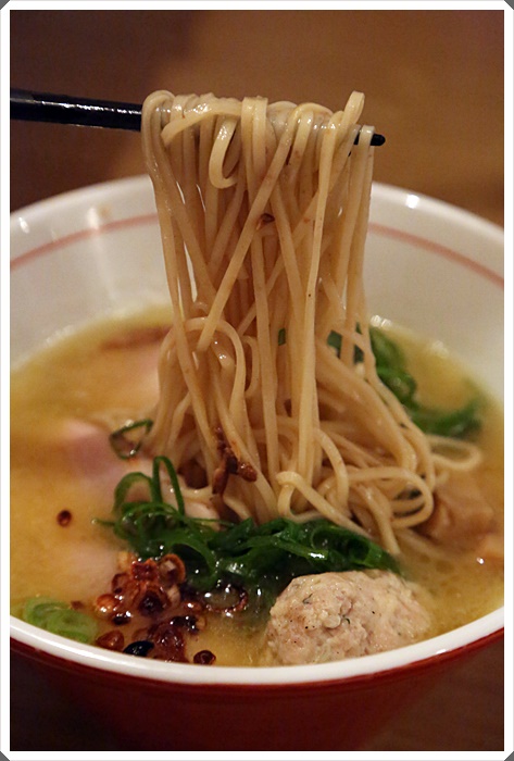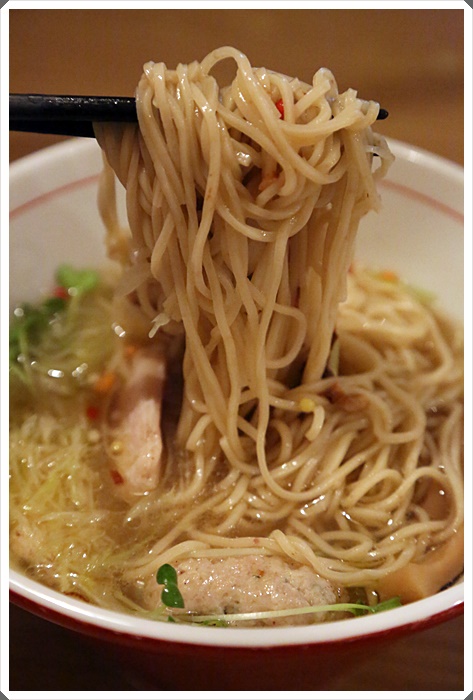 | 每一種麵的麵條都不太一樣,地球中華的拉麵總共有三種尺寸,雞湯麵的麵條最細,吃起來頗有台灣油麵的順滑感跟口感,MOMO相當的喜歡,不管是湯還是麵條都有一股香油味,果真好吃順口,後來才知道地球中華在油脂上也下了很大的功夫。 |