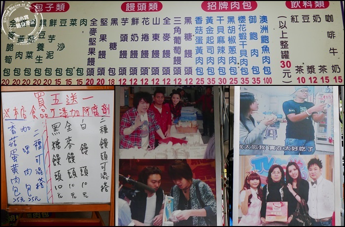 | 店裡的牆上有掛大大的菜單,有甜的包子也有饅頭,招牌肉包跟飲料類,種類超多可隨客人喜好挑選,門口的柱子貼了很多名人大力讚賞他們家肉包的照片,可見有多出名,手寫的看板裡會告知顧客優惠的品項,還有本店不添加防腐劑的字樣,就是要讓客人吃的安心,買的開心。 |