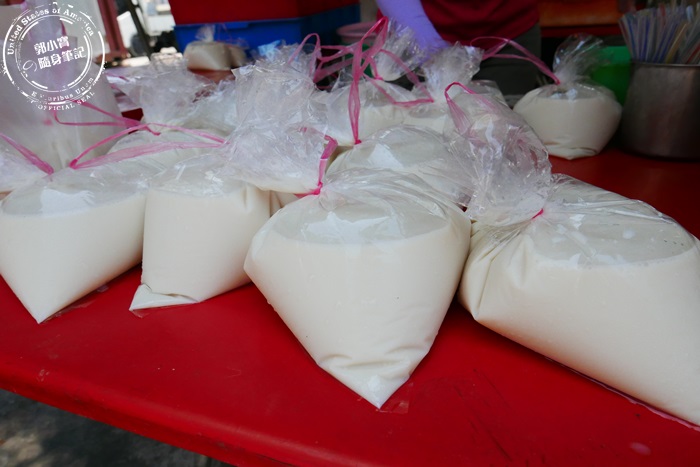 | 店家沒有菜單列表,所有東西都銅板價格,像這一大包豆漿才10元,也有5元的,而且不是便宜就不好喝喔,噢北編買了一包$10有糖還是冰的,超好喝的啦,豐富豆香真的很濃還喝的到些許微豆渣微甜不膩清涼解渴,重點才十塊大洋,一定要扛好幾包回去冰的,喝不了太多的就選小包的吧!但噢北編來的時候小包的已完售,無法拍照比對。 |