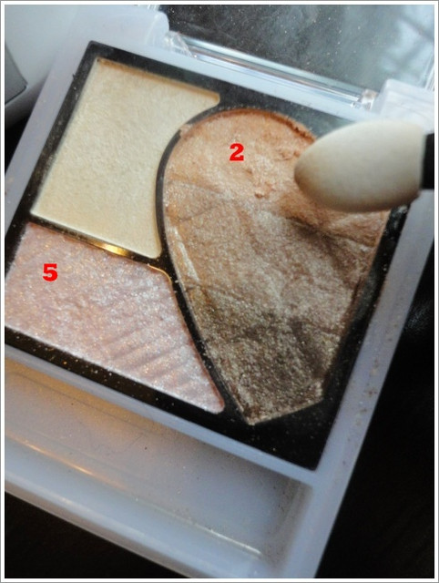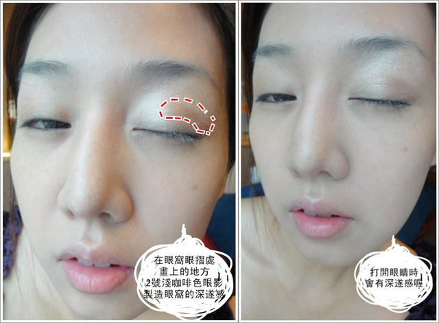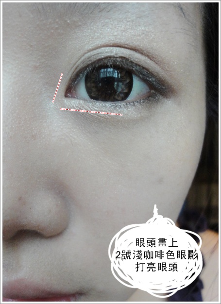 接下來用淺色的2號色眼影要打亮眼頭,讓眼距別太開,
