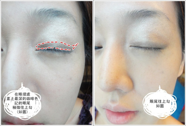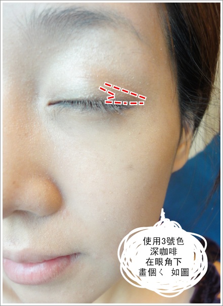 在眼尾的眼角,畫上ㄑ字眼影 如圖