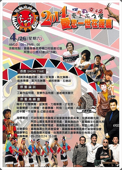 台灣原住民各族豐富的人文歷史及族群藝術精湛而多樣化,不同的文化風情及藝文的呈現,若能將其跨部落交流整合,結合各種原民文化差異,必能引起強烈迴響。本計畫以園遊會方式,結合各族原住民的傳統文化、歌舞展演、藝術創作及阿里山的觀光、人文、產業等,亦特邀各族群之名藝人及藝術家共同響應本次活動,此一原民藝文交流盛事透過中央各部會及企業的贊助與協助首次在「逐鹿社區」推出,冀希此藝文盛會能夠藉此契機在逐鹿社區蓬勃延續,並確立逐鹿社區將來是為『阿里山文化創意』之重鎮。