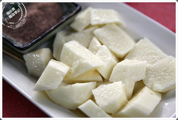 | 最後用一盤現切山藥做為結尾,這時候發現用山藥沾梅子粉很好吃耶,吃起來有點像是梨子的口感,脆度相當的脆,好吃!!! |