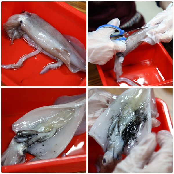 我們這次挑戰的就是小管一夜干,老實說我個人對小管、魷魚、軟絲幾乎都分不太出來,每次老師都會教,但是一直以來也都是搞不懂,它們有如三胞胎一樣認不清楚,我們小心翼翼的遵從老師教導的做法,看著老師做相當的簡單,但是自己動手做卻是感覺到困難重重,甚至一個不小心就把頭整個剪下來了,其實到完成品的時候很多人的一夜干早就沒了頭,就算躲過了第一關沒錯手把頭剪下來,在下面的步驟很多軟絲的頭還是不翼而飛。 |