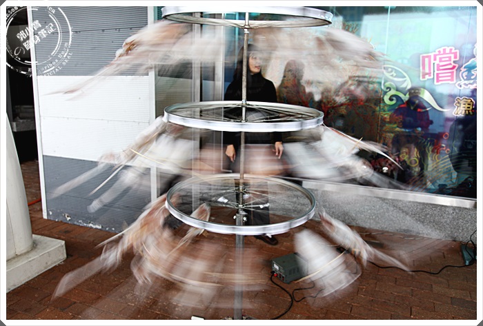 | 製作後老師請我們把軟絲掛在他門特製的風乾機上,等大家都掛好且記好自己的號碼時,老師就將機器打開,然後他就開始快樂的旋轉了,轉速還滿快的,瞬間就可以看到很多人的軟絲頭開始飛舞了,其中相當多的軟絲頭在這一次的試煉中不翼而飛了,現場看畫面的時候確實還滿好笑的,不過幸好我的軟絲在經過30分鐘的七彩迷紅燈還依然保存著。 |