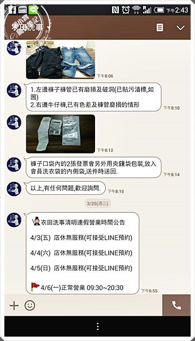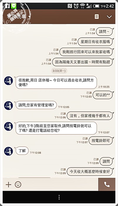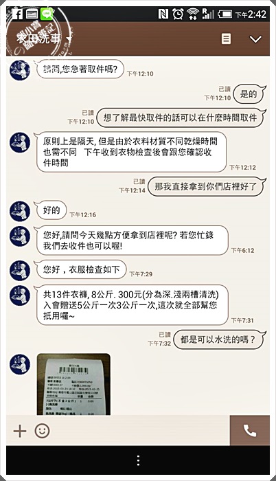 | 加入會員後,店員會主動跟會員要LINE,如果沒有LINE的話就會留電話,但是現在幾乎每個人都有LINE了,用通訊軟體直接跟洗衣店聯絡超方便的,當天我是一回台灣馬上就跟他門聯絡了,它們也會立即排時間來收衣服,真的太貼心了!!! |