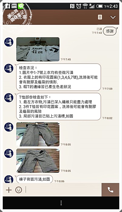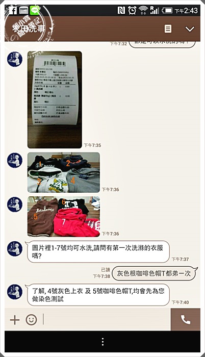 | 每次送洗的衣物都會拍照編號跟客戶做確認,問的相當的詳細,還會幫第一次洗滌的衣服做染色測試,有沒有這麼的細心阿,我以前花大錢去一般洗衣店也沒那麼的細心。 |
