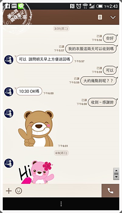 | 後來一忙起來幾乎都忘記跟對方確認衣服收送了,因為當初拿去的時候沒有確認送回的時間,一直到要出發前的兩天才想,馬上聯絡後隔天就送過來了,真方便XD |