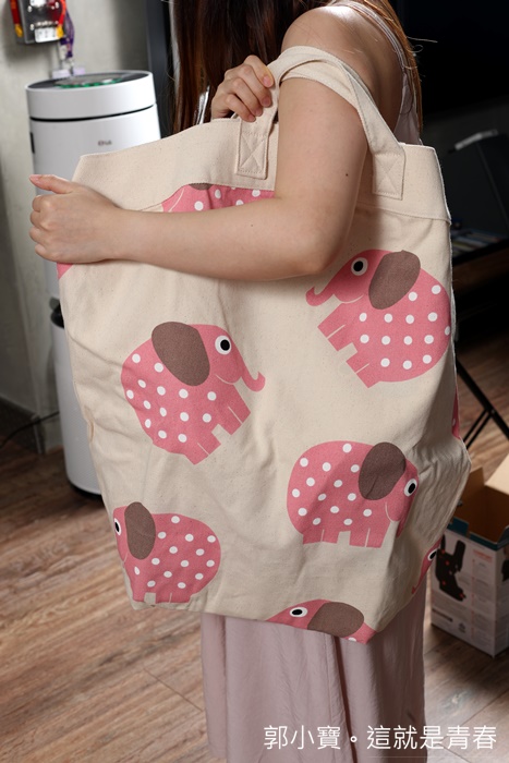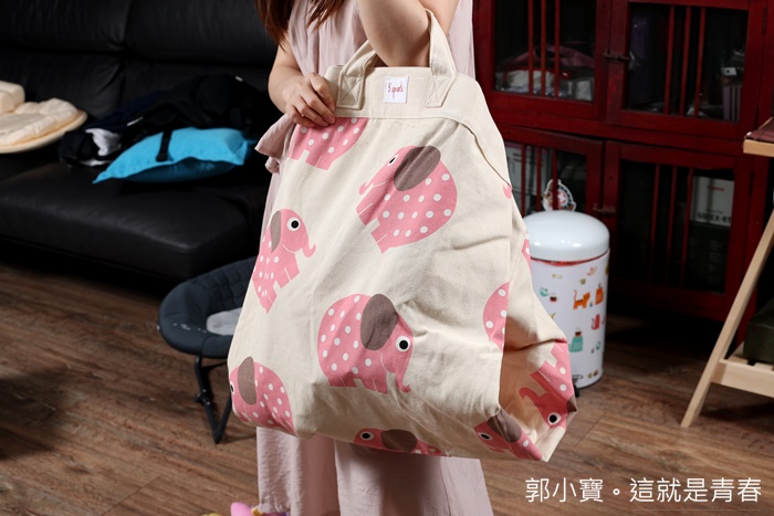 | 袋子收納起來的體積很小,翻開兩折後可以變成一個大袋子,提著或是單肩都很適合,乍看之下還以為是萬用媽媽包,我家太妃也很喜歡這玩具收納袋,很可愛! |