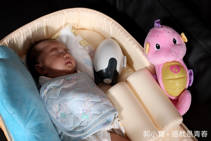 | 後來直接放在移動式床鋪也很方便,直接放在床鋪的話記得把搖晃感調整小一點,真的是穩睡的安撫神器,比一旁的費雪小海馬還好用!!! |