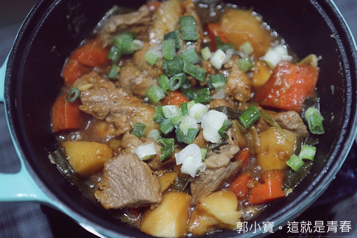 | 打開鍋蓋香噴噴的馬鈴薯燉肉就完成了,在灑上蔥花一整個就是完美,老實說我家太妃在嫁給我之前真的完全沒下廚過,因為我個人對廚電滿有研究的,所以要養成一個好廚師就先要有個好廚電就能讓功力加倍。 |