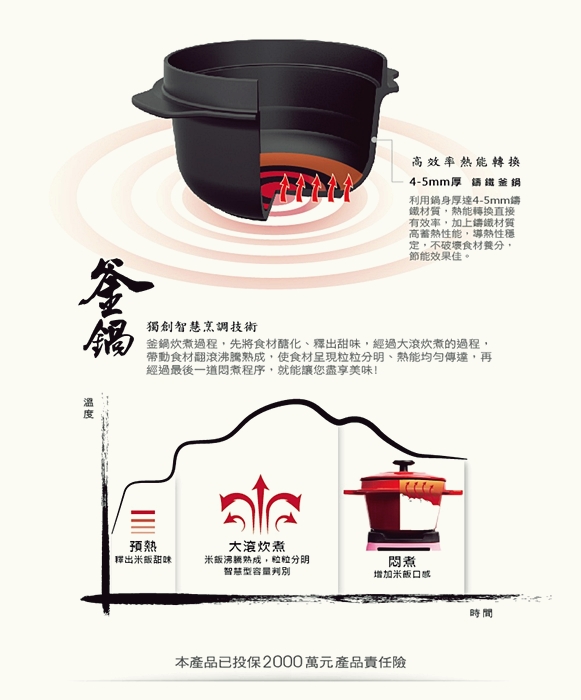 底座跟炊飯鑄鐵鍋都是特別訂做的,有自動感應偵測是否適用,如果不適用的話會發出警告音,選項紙有飯跟粥,但是卻可以煮出相當多樣化的商品,對於單身貴族或者小家庭來說,既美觀又實用,重點非常好收納!!