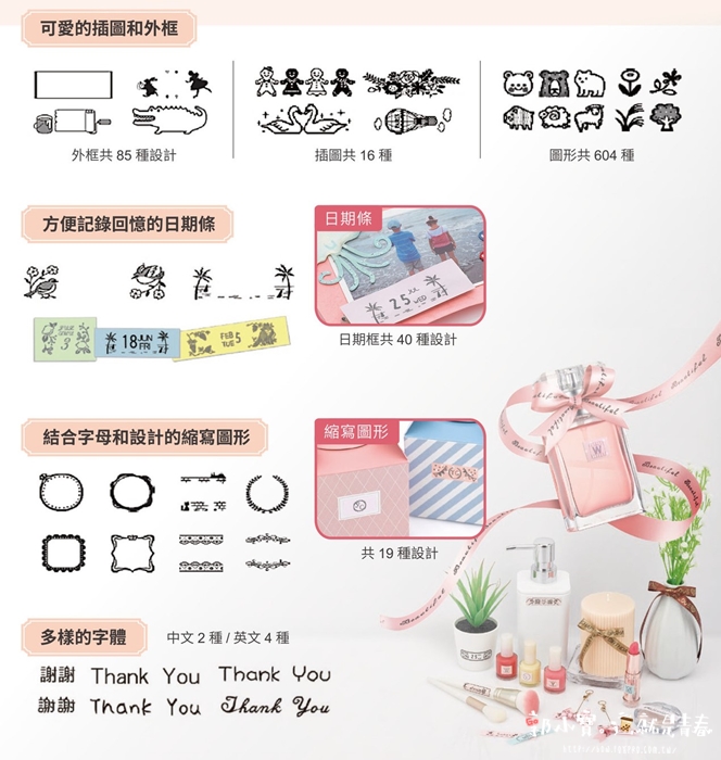 EPSON-LW-K420 美妝標籤機值得推薦的也是它是內建最多插圖跟外框的機型,絕對能滿足每個少女心噴發的朋友們,總共支援2種中文字型及4種英文字型,還有1124種符號與插圖以及85種外框、40種日期框、19種縮寫圖形!!