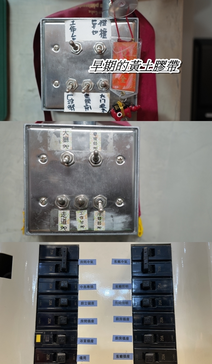 | 因為我們家是裝璜工業風的關係,所以很多都是直接走造型明管跟立體的復古開關盒,也因為工業風的關係,也需要用到很多大亮的燈光,所以一開始設計師就分了很多區域用燈,一個客廳有11個開關有夠複雜的,以前是裝潢師傅自己為了怕忘記拉錯線,所以用黃土膠先註明,後來完工後我就沒有撕下來,因為真的會忘記哪個開關開那些燈(冏),也因為電線全部從拉,所以配電箱搭出也都一整個從做,幾乎都分的很細,也剛好有標籤機,讓它們都有美美的貼紙標示XD |