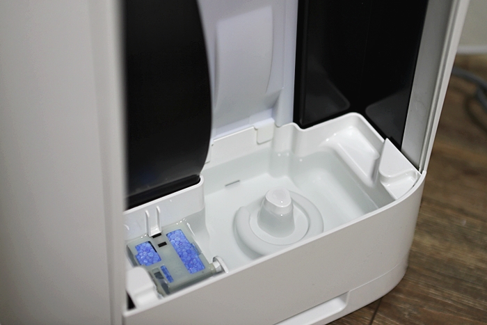 | 放上水箱後就會自動將水注入底盒內,這是我家裡面第一台自動除菌離子的清淨機,老實說我其實也很期待他的發揮怎樣的功能。 |