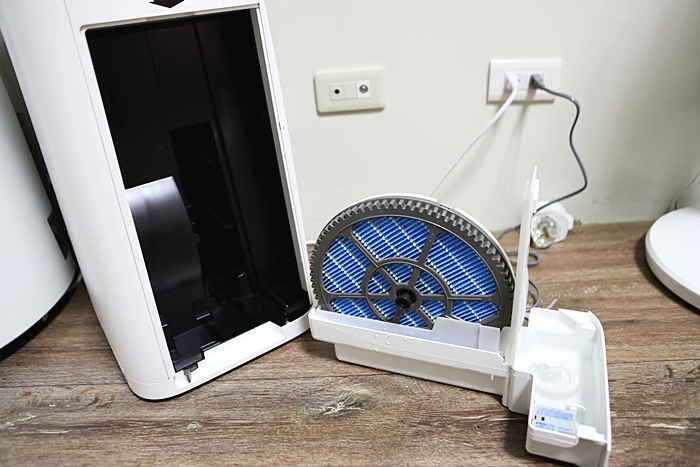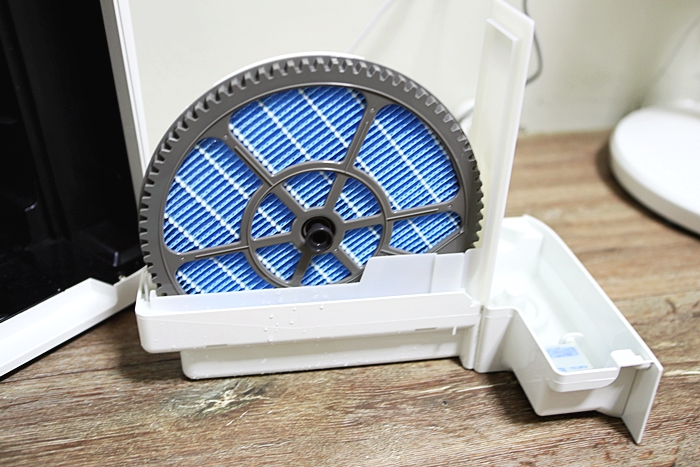 水濾網會吸附水分並旋轉藉由出風帶至空氣中,如果不使用時,濾網會歸位至塑膠材質部分,避免加濕濾網長期泡在水中,啟用加濕功能時水在經過濾網時也可過濾大顆料的雜質。室內保持一定濕度才會有好的效果,雖然台灣本身就是潮濕的環境。