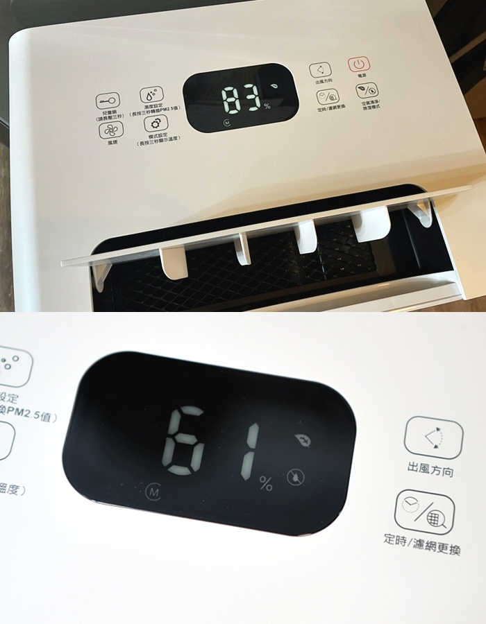 打開備蓋也可以看到後面右上方的孔洞,裡面就是偵測屋內空氣品質以及溫度濕度的感測器,除濕機在運轉的時候,也同樣會定期偵測濕度、溫度、空氣品質,傳導到面板上讓消費者可以看到數據。 |