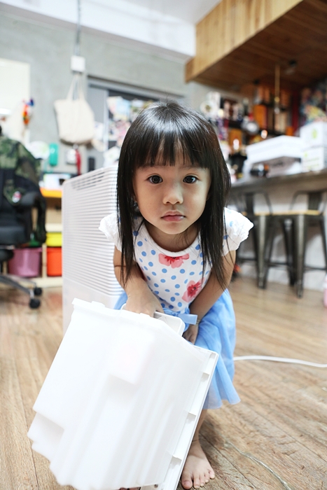 前方有三色燈號,分別是紅色(髒)、紫色(普通)、藍燈(良好) ,看燈號一目了然就知道空氣的好壞,搭配一下我家女兒的表情就知道空氣狀況了,且可以單獨使用空氣清淨機的模式,超方便!! |