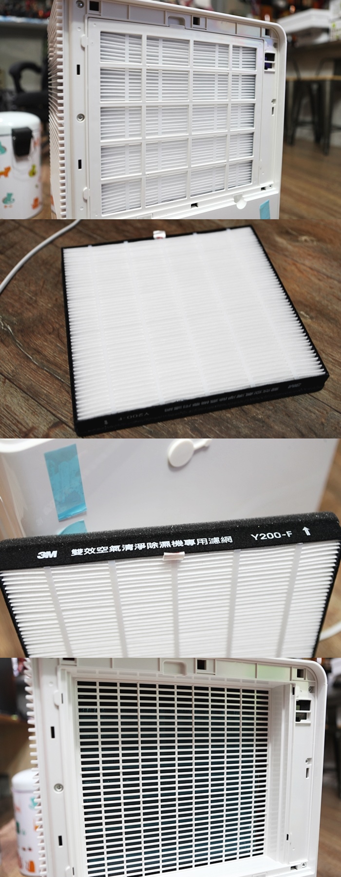 被蓋出起來可以看到前置濾網,前置濾網就像冷氣濾網一樣可以做水洗清潔,清淨濾網的則是3M的專利靜電濾網,可以過濾到0.003微米,可以看到濾網上面標示濾網型號為Y200-F通用濾網,淨化空氣的原理是獨家專利靜電吸附,加上利用濾網的細微孔徑做髒污空氣的截斷,再排出乾淨新鮮的空氣。