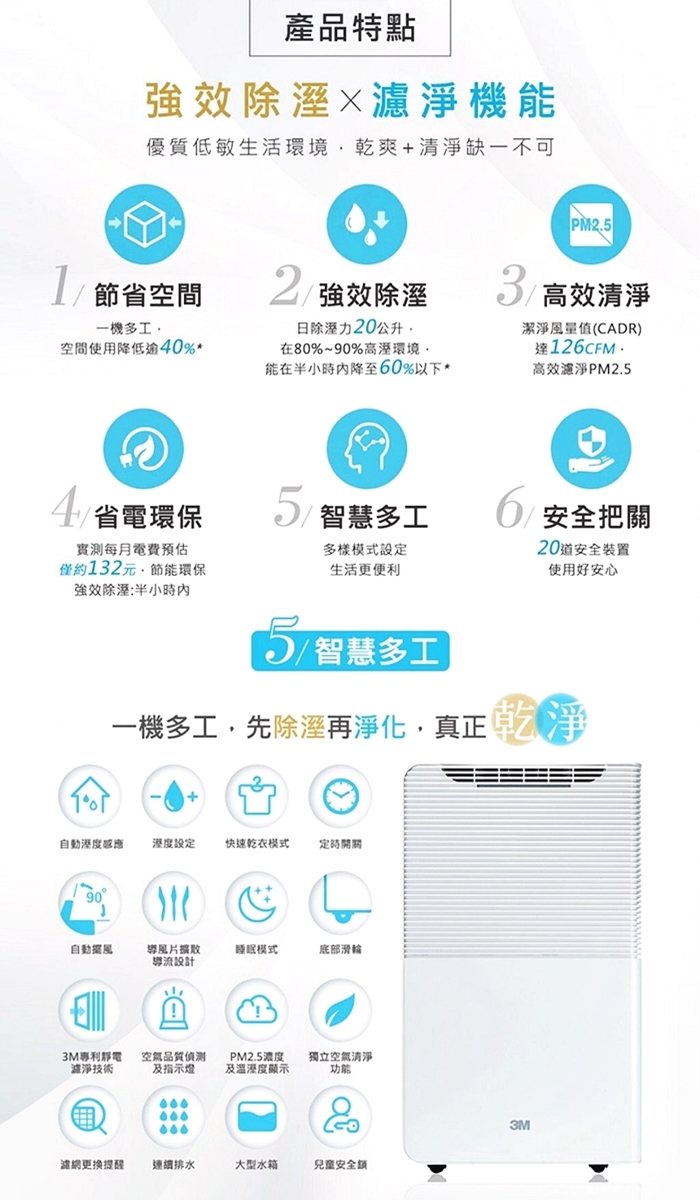 3M本身就是國際知名大廠,擁有超多專利技術,它們家的品質不管在哪個方面都是領先群雄,所以我也很相信他們的獨家靜電集塵,省去了昂貴的濾網費用,加上除濕機又非常強,買一台賺一台的感覺,絕對是你省荷包的最佳雙效機種。 |