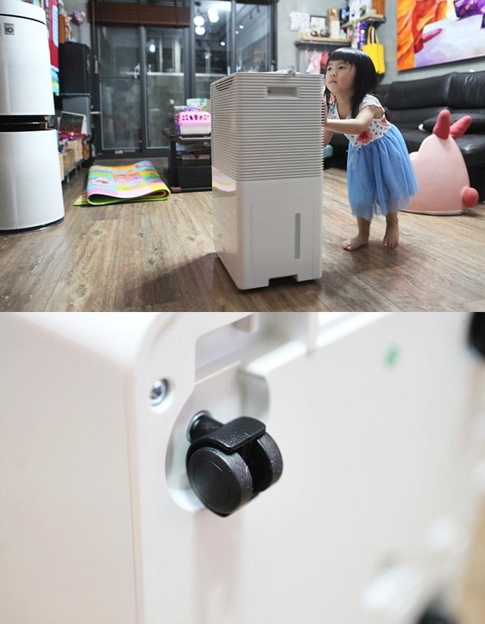除濕機下方裝有360度的轉向輪,即使重達18公斤的3M雙效霸王機也可以輕鬆移動,連我們家Cola都可以輕鬆推動所以不用擔心移動困難。