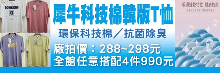 | 犀牛科技棉韓版T恤(男),全館短袖 288元、290元、298元,任搭四件990元。 |