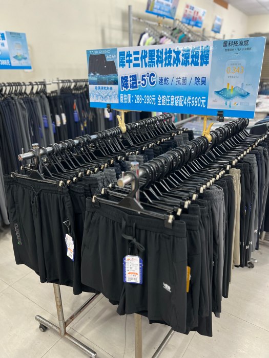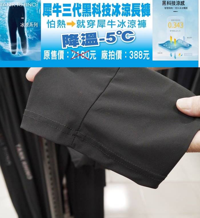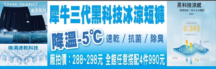 | 犀牛三代黑科技冰涼短褲,全館短袖 288元、290元、298元,任搭四件990元。 |