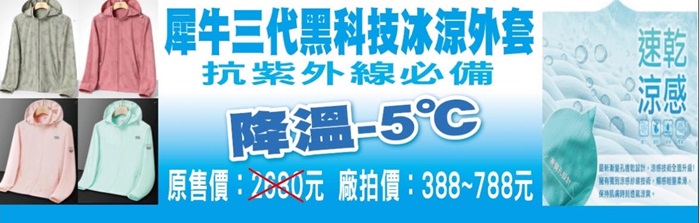 | 夏天必備的涼感防曬外套,穿上他比沒穿還涼,高雄的天氣很炎熱,穿上這件更降溫,舒適感大增。晚上運動我都會套上一件輕薄的運動外套,犀牛坦克的透氣外套我也滿推薦的,穿起來非常舒服以外,還有幾款有反光條的設計,夜晚運動更安全,口袋的部分都是有拉鍊的,加上連帽的設計下著毛毛雨也可以輕鬆運動。 |