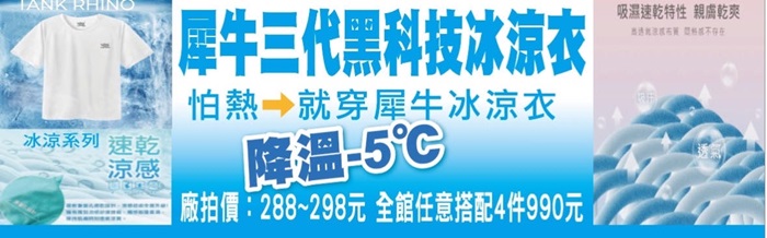 | 犀牛三代黑科技冰涼衣系列(男),全館短袖 288元、290元、298元,任搭四件990元。 |