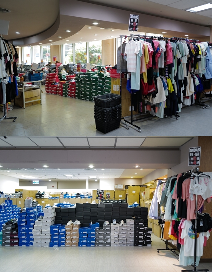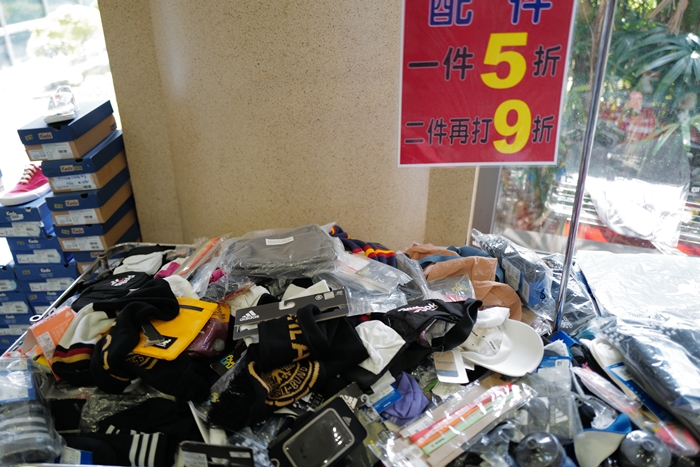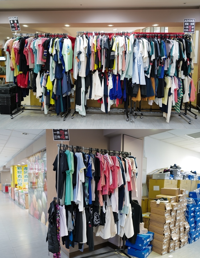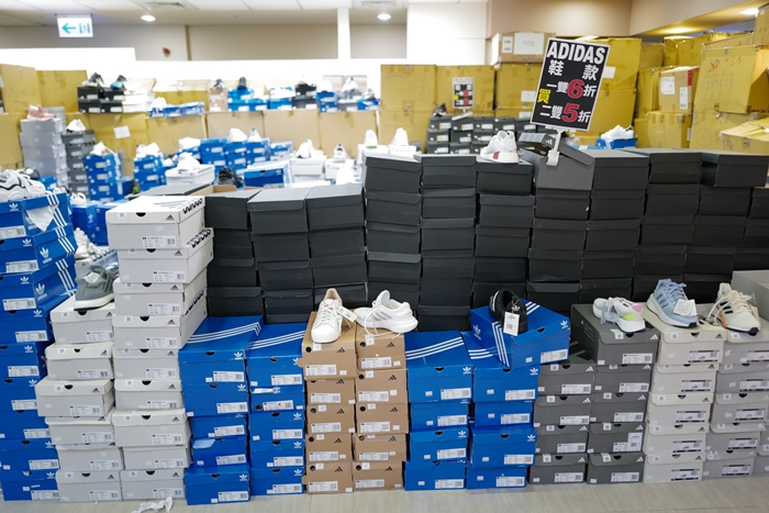 | 第一天去拍照就瞬間被人潮排滿,工作人員一邊吊掛一邊賣貨,根本一整理好就被挑走一堆,買氣非常熱絡,鞋款最低3.5折,畢竟愛迪達的服飾真的都很好看加上難得三件就可以直接打到4折,這樣的價格真的非常超值。 |