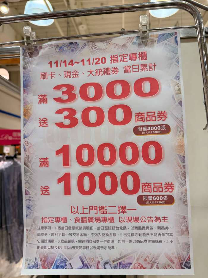 11/14~11/20 1還有大樂週年慶活動,滿 3000送 300 商品券;滿 10000送 1000 商品券,以上門檻二擇一 |