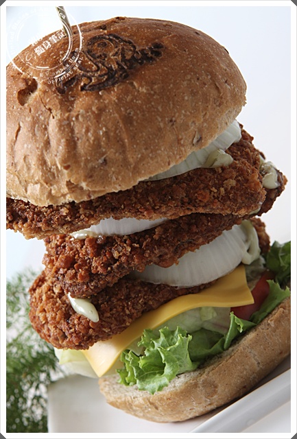 這三層雞肉堡真的是太大了,即使壓扁他的高度還是非常之高, |