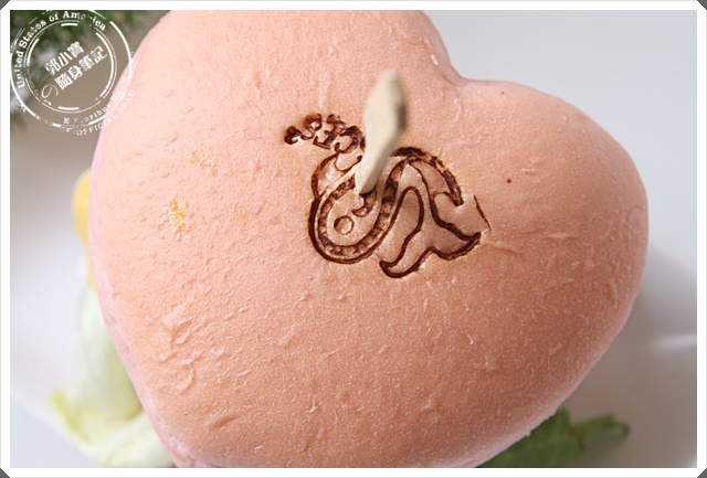 上面還印有雙魚二次方的LOGO圖,粉紅麵包聞起來的香味挺香的,一整個很不捨得吃他,