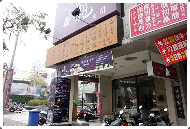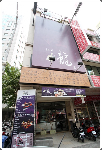 | 江戶龍壽司位於自由路上,附近挺不好停車的,門口掛著商業午餐699的宣傳單。 |