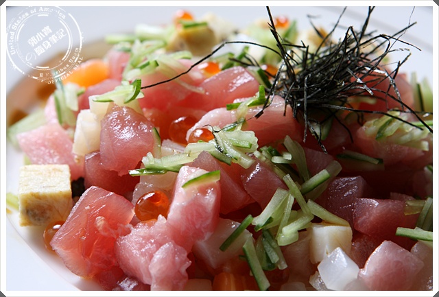 看起來非常鮮艷的及美觀的丼飯,材料非常的多,口感層次豐富,每咀嚼都能品嘗到不同的風味。
