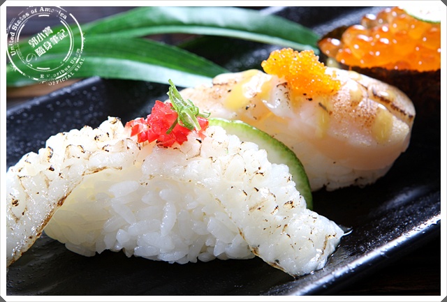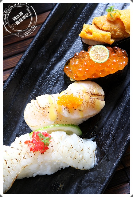 比目魚側邊炙燒、干貝、鮭魚卵、海膽握壽司 |