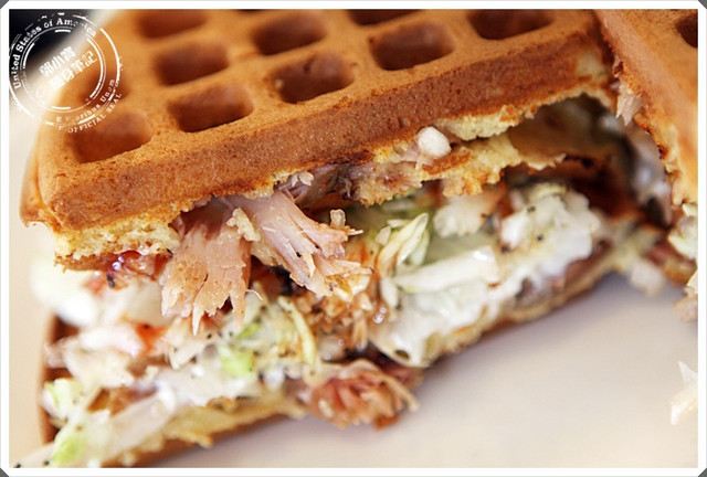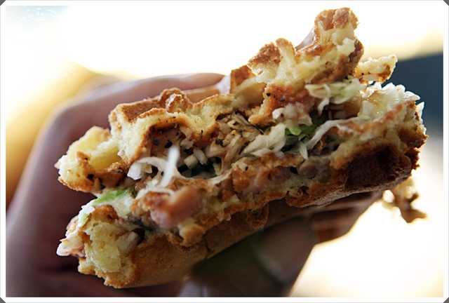 第一個鬆餅就讓我們驚豔到了,是聽都沒聽過的三杯雞鬆餅,而且是鬆餅三明治耶!