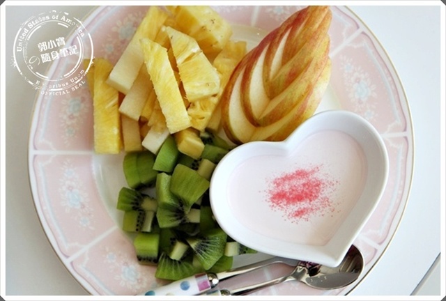 | 上層的新鮮水果搭上粉紅色的奶烙,一份簡單卻又幸福的料理,讓一整個下午都飽受視覺與味覺的饗宴。 |