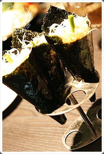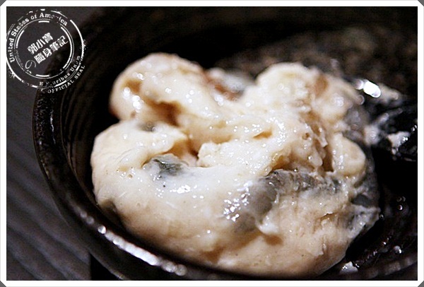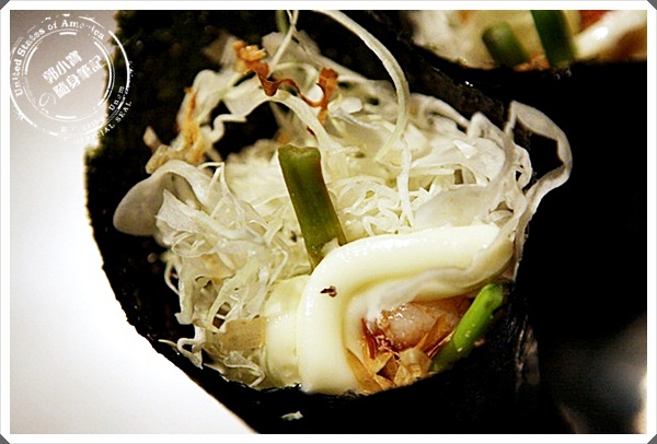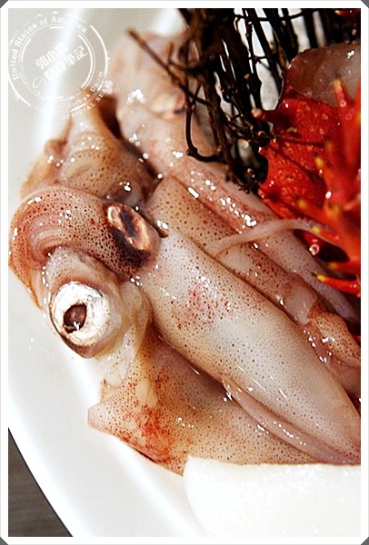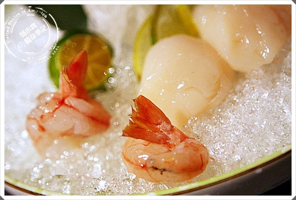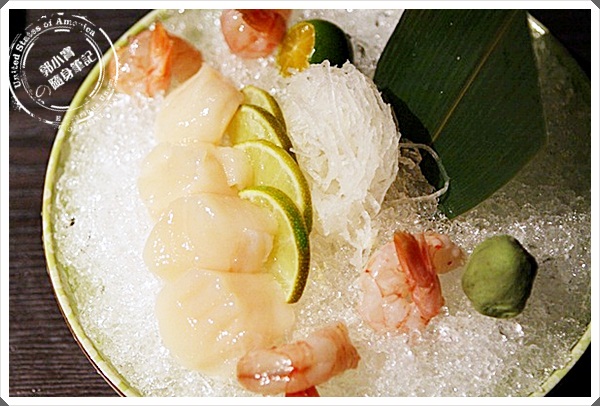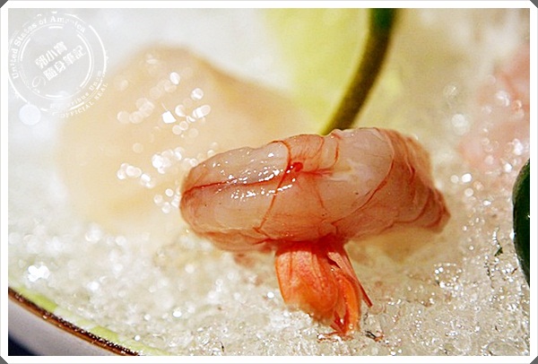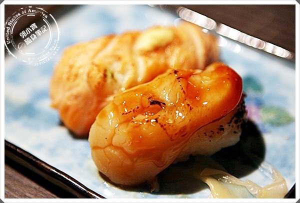 | 漂亮擺盤又一發,生干貝吃起來果然比干貝握壽司品質來的高了很多,甜味十足,擠上一點金吉檸檬更美味。 |