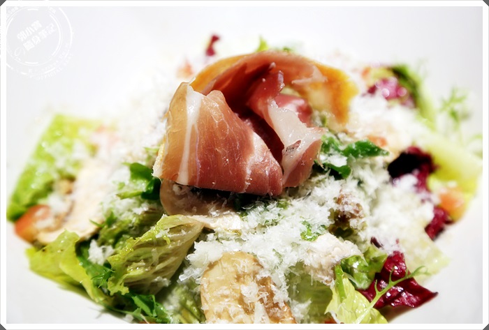 沙拉裡的蔬菜非常的新鮮,而且我第一眼就把帕馬火腿相中,快速的夾走了!!